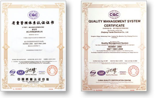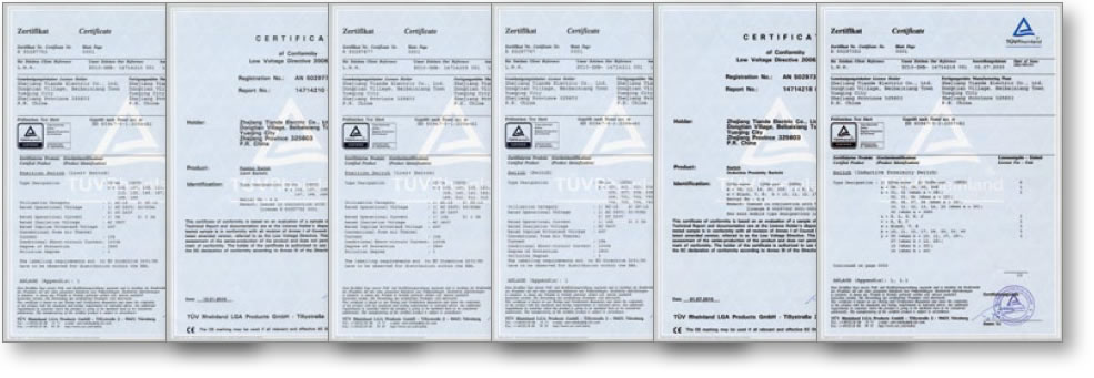 公司已通過ISO9001:2008質量體系認證。生產的三十余系列,上千種規(guī)格的產品,已經通過了國家的CCC認證和TUV出具的CE認證。